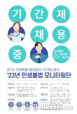 신청 기간은 3월 17일 오후 6시까지며, 경기도 일자리재단 통합접수시스템 잡아봐 어플라이의 기간제 채용관에서 접수할 수 있다. 문의 사항은 도 민생특별사법경찰단으로 연락하면 된다.