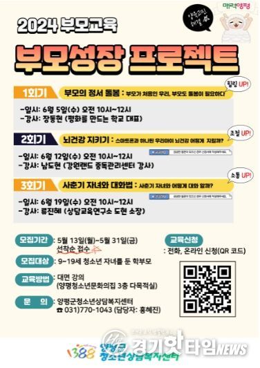 [경기핫타임뉴스=김형철 기자] 양평군 청소년상담복지센터(센터장 이상은)는 오는 6월 5일부터 19일까지 ‘부모성장 프로젝트’ 부모교육을 진행한다고 밝혔다.