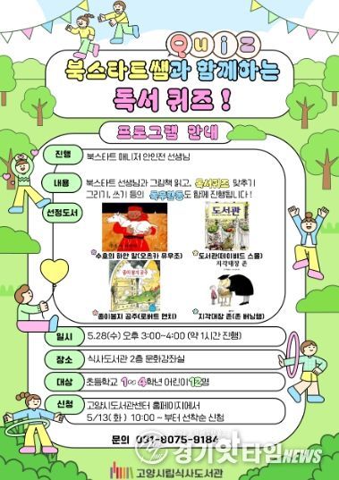 [경기핫타임뉴스=김형철 기자] 고양특례시 식사도서관이 어린이 공공도서관 북스타트 연계 프로그램‘북스타트 선생님과 함께 푸는 독서퀴즈’를 오는 28일 운영한다고 밝혔다.