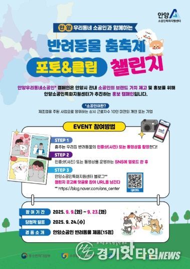 [경기핫타임뉴스=김삼영 기자] 안양산업진흥원은 오는 23일까지 안양시민을 대상으로 2025년 안양우리동네소공인과 함께하는 ‘반려동물춤축제 포토&클립 이벤트’를 개최한다고 9일 밝혔다.