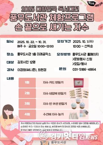[경기핫타임뉴스=김형철 기자] 김포시 풍무도서관은 2025 대한민국 독서대전 사업의 일환으로 오는 10월 22일부터 31일까지 총 4회에 걸쳐 수·금요일 오전 10시부터 12시까지 ‘손 끝으로 새기는 자수’를 운영한다.