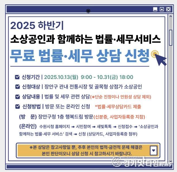 [경기핫타임뉴스=김삼영 기자] 수원시 장안구는 오는 10월 13일부터 법률·세무 상담을 받기 어려운 관내 전통시장 및 골목형 상점가 소상공인을 대상으로 쉽고 편리하게 상의할 수 있는 무료 상담인 ‘소상공인과 함께하는 법률·세무 서비스’ 사업을 운영한다.