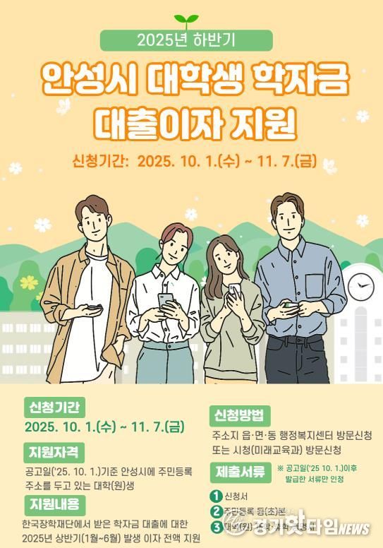 [경기핫타임뉴스=김삼영 기자] 안성시는 오는 10월 1일부터 11월 7일까지 ‘2025년도 하반기 안성시 대학생 학자금 대출이자’ 지원 신청을 받는다.