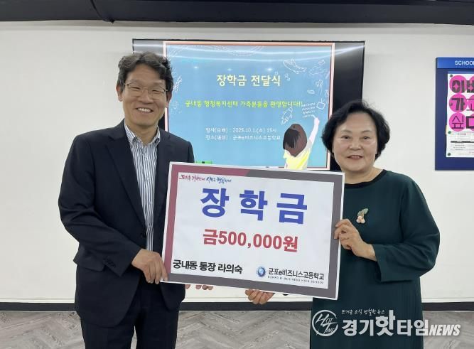 [경기핫타임뉴스=김삼영 기자] 라의숙 군포시 궁내동통장협의회장은 10월 1일 군포e비즈니스고등학교에 장학금을 전달하며 지역 청소년들의 꿈을 응원하는 뜻깊은 나눔을 실천했다.