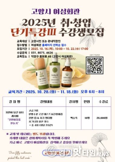 [경기핫타임뉴스=김형철 기자] 고양특례시 여성회관에서는 친환경과 건강을 중시하는 최신 트렌드를 반영한‘취창업 단기특강Ⅲ’수강생을 모집한다.