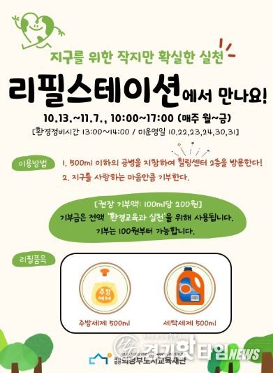 [경기핫타임뉴스=김형철 기자] (재)의정부도시교육재단은 10월 13일부터 11월 7일까지 매주 월요일부터 금요일, 오전 10시부터 오후 5시까지 힐링센터 2층에서 생활 속 친환경 실천 활동 ‘리필스테이션’을 운영한다.