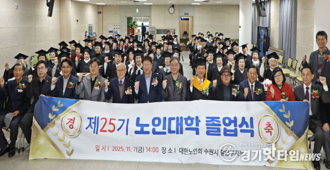 [경기핫타임뉴스=김삼영 기자] 지난 11월 7일, 대한노인회 수원시 팔달구지회에서는 팔달구청장 및 내빈들을 모시고 68명의 졸업생들과 함께 제25회 노인대학 졸업식을 개최했다.