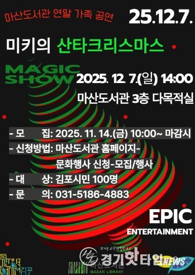 [경기핫타임뉴스=김형철 기자] 김포시 마산도서관은 다가오는 크리스마스를 기념하여, 가족 단위로 관람할 수 있는 마술 공연 프로그램 ‘미키의 산타크리스마스’를 진행한다.