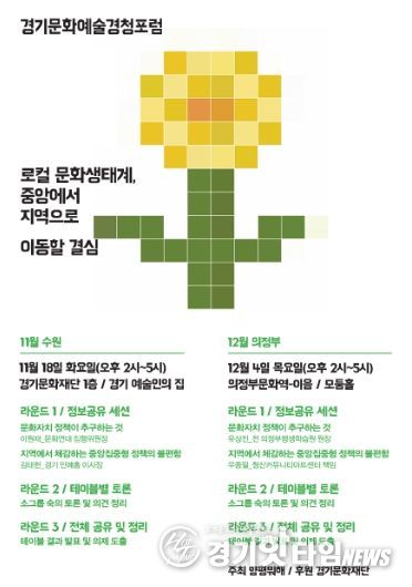 경청포럼은 국민주권정부의 문화정책 변화와 함께 경기도가 준비 중인 기초지자체 기반의 상향식 지역문화 정책의 기본 방향을 가늠해 보기 위해 경기 남부(수원)와 북부(의정부)에서 각각 11월 18일 오후 2시(수원 경기문화재단 경기예술인의 집)와 12월 4일 오후 2시(의정부문화역-이음)에 열린다.