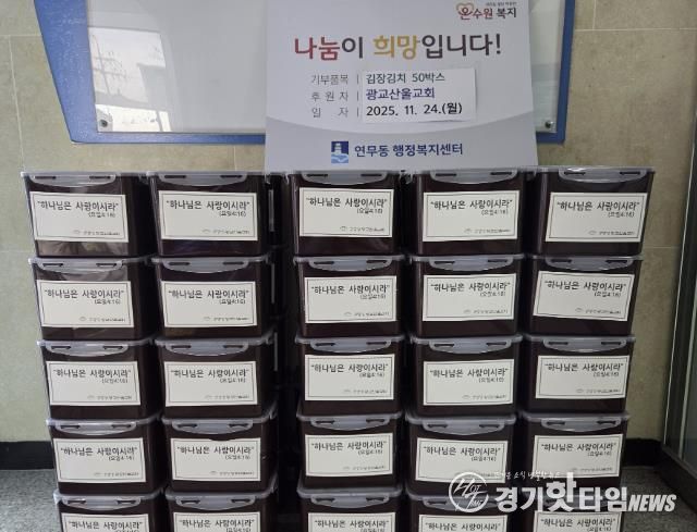 공순정 연무동장은 “추운 겨울을 앞두고 따뜻한 정성을 담아 김장김치를 기부해주신 광교산울교회에 깊이 감사드린다”며 “기부해주신 김치는 꼭 필요한 이웃들에게 소중히 전달하겠다”고 전했다.