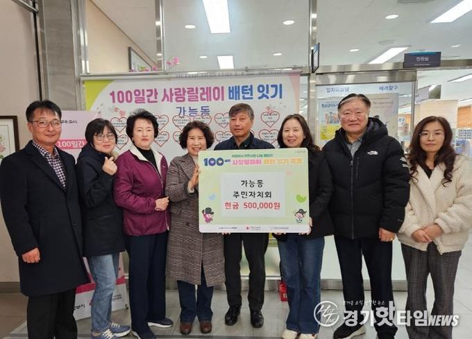 [경기핫타임뉴스=김형철 기자] 의정부시 가능동주민센터는 11월 21일 가능동 주민자치회가 지역 내 어려운 이웃을 돕기 위해 성금 50만 원을 기탁하며 ‘100일간 사랑릴레이 배턴 잇기’에 동참했다고 밝혔다.