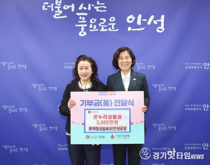 [경기핫타임뉴스=김삼영 기자] 안성시는 지난 11월 24일 롯데칠성음료(주) 안성공장으로부터 지역사회 복지 향상과 전통시장 활성화를 위해 온누리상품권 3천만원을 기부받았다고 밝혔다.