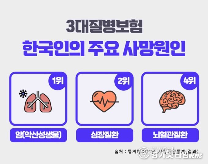 [경기핫타임뉴스=김형철 기자] 흔히 3대질병이라 일컫는 암, 심혈관질환, 뇌혈관질환은 통계청 발표자료에 따르면 한국인의 주요 사망원인 중에서 3위 폐렴을 제외하고 1~4위를 차지하고 있으며, 이전부터 지금까지도 살면서 가장 먼저 대비해야 하는 치명적인 질병으로 강조되고 있다. 이러한 중대질병에 대비하기 위하여 상기 세가지 치명적인 질병을 집중보장하는 3대질병진단비보험을 많이 가입하고 있다. 3대진단비보험은 각각의 질병을 중점적으로 보장하면서도 가입자 특성에 맞는 특약을 추가함으로써 종합건강보험으로도 활용할 수가 있다.
