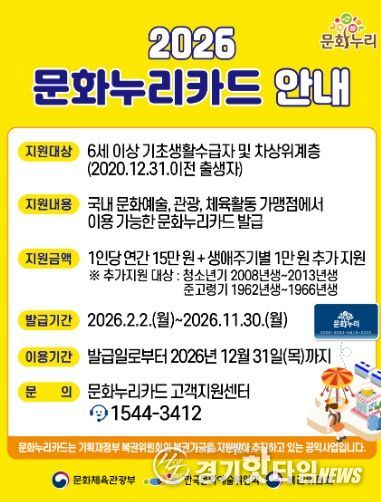 [경기핫타임뉴스=김형철 기자] 정부 정책에 따라 2026년부터 통합문화이용권(문화누리카드)과 청년문화예술패스 제도가 개편된다. 이에 따라 양주시는 개편 기준에 맞춰 지역대상자를 대상으로 해당 사업을 확대 시행한다고 밝혔다.