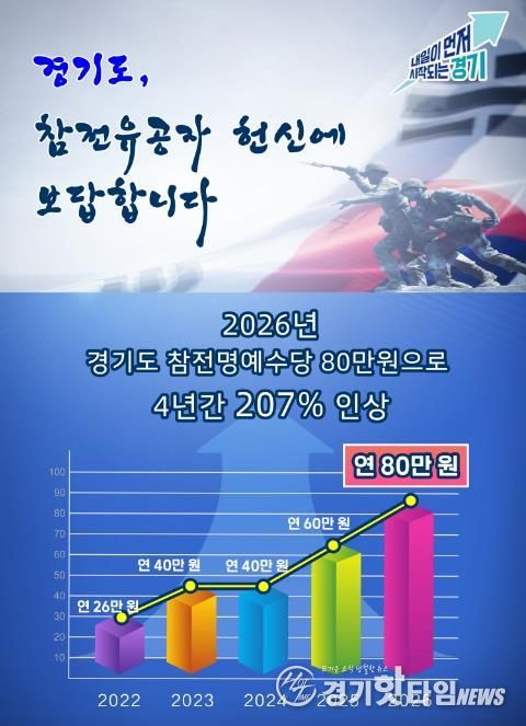 [경기핫타임뉴스=김삼영 기자] 경기도가 참전유공자에 대한 예우를 강화하기 위해 2026년 경기도 참전명예수당을 연 80만 원으로 인상했다.