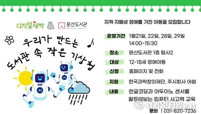 [경기핫타임뉴스=김형철 기자] 파주시 문산도서관은 한국과학창의재단의 ‘디지털새싹’교육지원 사업의 일환으로, 지적·자폐성 장애 아동을 위한 인공지능 교육 프로그램 ‘우리가 만드는 도서관 속 작은 기상청’을 운영한다.