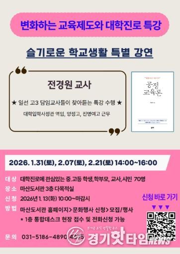 [경기핫타임뉴스=김형철 기자] 김포시 마산도서관이 1월 31일, 2월 7일, 2월 21일 2월 21일 3회에 걸쳐 오후 2시부터 4시까지 ‘변화하는 교육환경(슬기로운 학교생활)’에 관심이 있는 중고등학교 학부모, 교사, 학생 등 김포시민을 대상으로 특별강연을 운영한다.