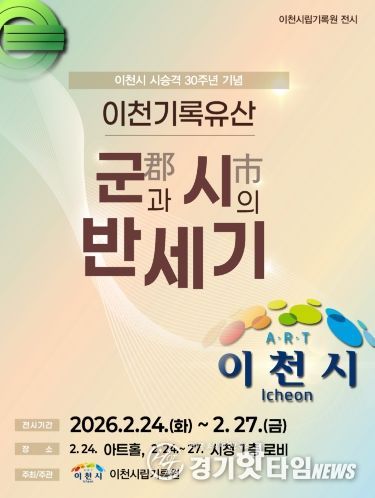 [경기핫타임뉴스=김형철 기자] 이천시는 오는 2월 24일부터 27일까지 이천시 시 승격 30주년을 기념하는 이천시립기록원 전시회 ‘이천기록유산(利川記錄遺産): 군(郡)과 시(市)의 반세기’를 개최한다고 밝혔다.