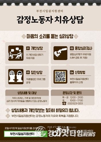 [경기핫타임뉴스=김형철 기자] 부천시여성청소년재단이 운영하는 부천시일쉼지원센터 치유상담실은 감정노동자에게 전문가 개인상담과 종합심리검사 등을 지원한다.