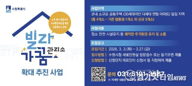 [경기핫타임뉴스=김삼영 기자] 수원특례시는 노후 빌라 밀집지역을 체계적으로 관리하고, 주거환경을 개선하는 ‘2026년 빌라가꿈관리소 확대 추진사업’의 대상지 신청을 3월 27일까지 받는다.