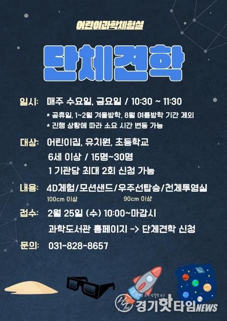 [경기핫타임뉴스=김형철 기자] 의정부과학도서관은 어린이집, 유치원 및 초등학교를 대상으로 3월부터 어린이과학체험실 단체 견학 프로그램을 운영한다.