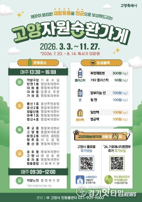 [경기핫타임뉴스=김형철 기자] 고양특례시 덕양구 주교동은 오는 3월 3일부터 주민들의 자발적인 자원순환 실천을 돕고 온실가스 감축에 기여하기 위해 ‘고양 자원순환가게’를 본격 운영한다고 24일 밝혔다.