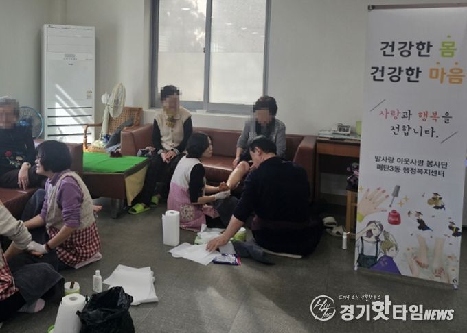 [경기핫타임뉴스=김삼영 기자] 수원시 영통구 매탄3동 발사랑 이웃사랑 봉사단은 25일, 매탄3동 위브경로당을 찾아 어르신들을 위한 ‘찾아가는 발마사지 봉사활동’을 펼쳤다.
