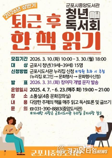 [경기핫타임뉴스=김삼영 기자] 군포시중앙도서관은 군포시 청년들의 인문교양 증진과 독서문화 활성화를 위해 2026년 4월부터 상반기 청년독서회 '퇴근 후 한 책 읽기 : 소설을 읽다, 사람을 읽다'를 운영한다.