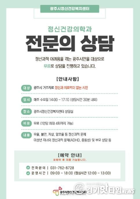 [경기핫타임뉴스=김삼영 기자] 광주시정신건강복지센터는 지역 주민의 정신건강 증진과 심리지원 강화를 위해 2월부터 정신건강의학과 전문의 무료 상담을 운영하고 있다고 27일 밝혔다.