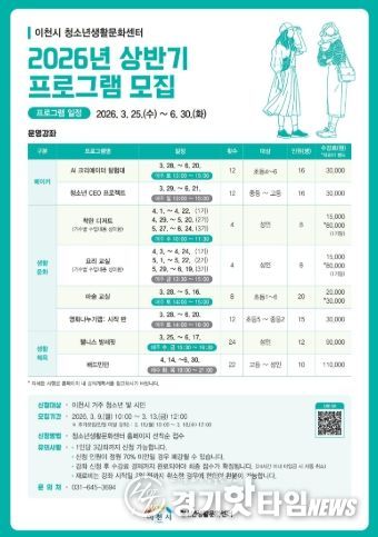 [경기핫타임뉴스=김형철 기자] 이천시 청소년생활문화센터가 청소년과 지역주민의 건강한 생활문화 형성과 역량 강화를 위해 ‘2026년 상반기 프로그램’을 운영하고 수강생을 모집한다고 밝혔다.