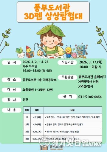 [경기핫타임뉴스=김형철 기자] 김포시 풍무도서관은 초등학생 1~3학년을 대상으로 ‘3차원 펜 상상탐험대’를 오는 4월 2일부터 4월 23일까지 매주 목요일 오후 4시부터 6시까지 총 4회에 걸쳐 운영한다.