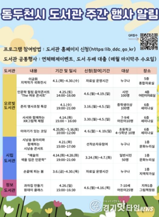 [경기핫타임뉴스=김형철 기자] 동두천시가 오는 4월 1일부터 30일까지 도서관의 날과 도서관 주간을 맞아 시민들의 일상에 활력을 더하고 독서문화 확산을 위한 다양한 문화 행사를 운영한다.