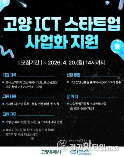 [경기핫타임뉴스=김형철 기자] 고양산업진흥원이 ‘2026년 고양 ICT 스타트업 사업화 지원사업’ 참여 기업을 모집한다.