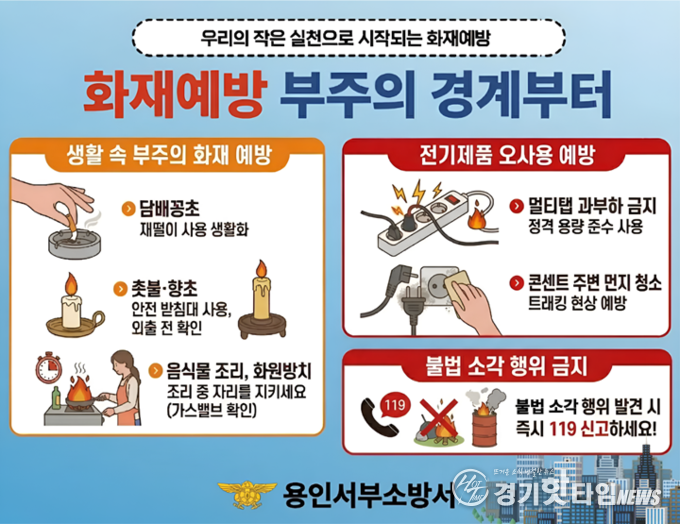 [경기핫타임뉴스=김삼영 기자] 용인서부소방서는 봄철을 맞아 부주의로 인한 화재 예방을 위한 예방수칙을 적극 홍보한다고 3일 밝혔다.