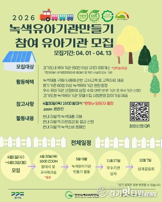 [경기핫타임뉴스=김삼영 기자] 경기도가 아이들이 생활 속에서 올바른 녹색 소비 습관을 가질 수 있도록 돕는 ‘2026년 녹색유아기관만들기’ 참여 기관 200곳을 4월 13일까지 모집한다.