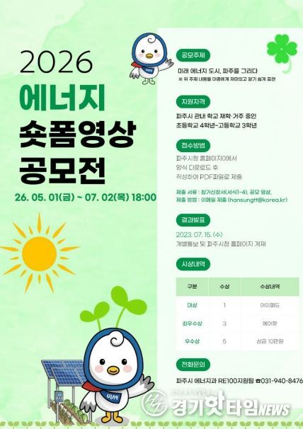 [경기핫타임뉴스=김형철 기자] 파주시는 청소년들의 에너지 인식을 제고하고 디지털 미디어 활용 역량을 강화하기 위해 녪년 파주시 청소년 에너지 숏폼 영상 공모전’을 개최한다.