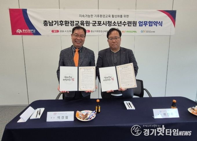 [경기핫타임뉴스=김삼영 기자] (재)군포시청소년재단이 운영하는 군포시청소년수련원(충남 청양)과 충남기후환경교육원(충남 청양)은 4월 9일, 미래세대의 지속가능 기후환경교육 활성화를 위한 업무협약을 체결했다고 전했다.