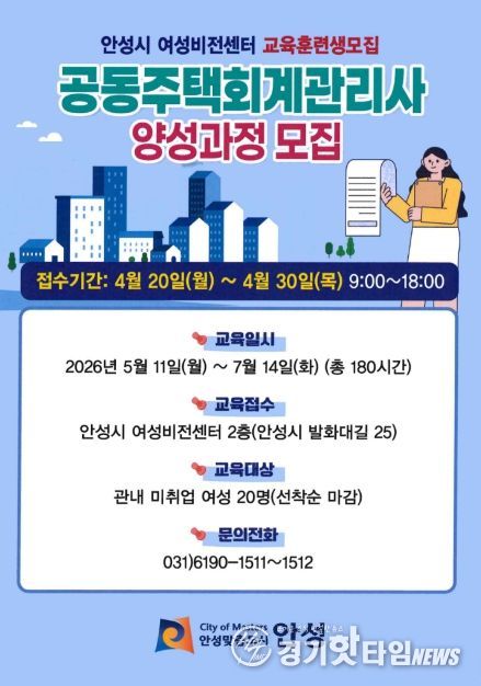 [경기핫타임뉴스=김삼영 기자] 안성시 여성비전센터는 경력보유여성의 성공적인 재취업을 지원하기 위해 오는 4월 30일까지 ‘공동주택 회계 관리사 양성과정’에 참여할 직업 훈련생 20명을 모집한다고 밝혔다.