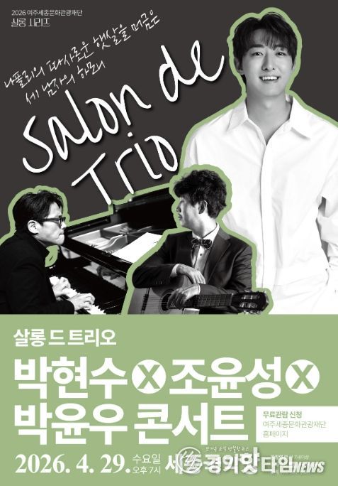 [경기핫타임뉴스=김형철 기자] 여주세종문화관광재단이 오는 29일, 문화가 있는 날을 맞아 2026년 특별기획 살롱 시리즈의 세 번째 무대 '살롱 드 트리오 박현수X조윤성X박윤우 콘서트'를 세종국악당에서 개최한다.