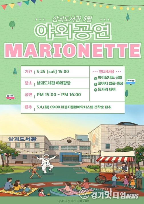 [경기핫타임뉴스=김삼영 기자] 화성시립 삼괴도서관은 5월 가정의 달을 맞아 오는 5월 23일, 도서관 야외광장에서 가족 단위 이용자를 위한 특별한 문화행사를 운영한다. 따뜻한 봄날의 야외 공간에서 누구나 편안하게 즐길 수 있도록 마련된 이번 행사는 도서관을 찾는 시민들에게 색다른 문화 경험과 여유로운 시간을 제공할 예정이다.