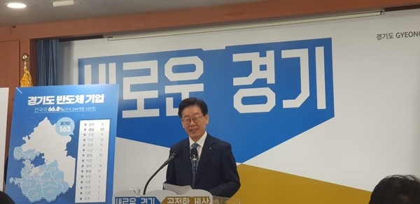 이재명 경기도지사는 18일 오전 10시 경기도청 브리핑룸에서 'SK하이닉스 반도체 특화 클러스터‘ 입지와 관련한 기자회견을 열고 경기도는 최적지로써 모든 준비가 되어있다고 입장을 밝혔다.