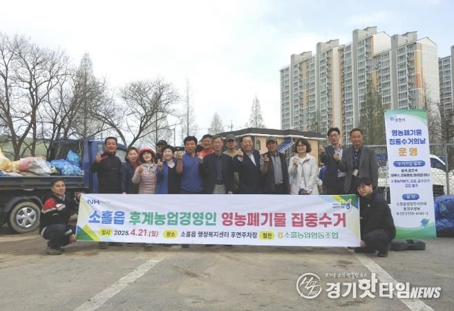 이날 활동에는 소흘읍 남녀 농업경영인회, 마을 이장, 소흘농협 등 관계자가 함께 참여해 관내 농지에 방치된 폐비닐 등 약 12톤의 영농폐기물을 수거했다. 수거된 영농폐기물은 한국환경공단으로 이송돼 재활용 자원으로 활용될 예정이다.