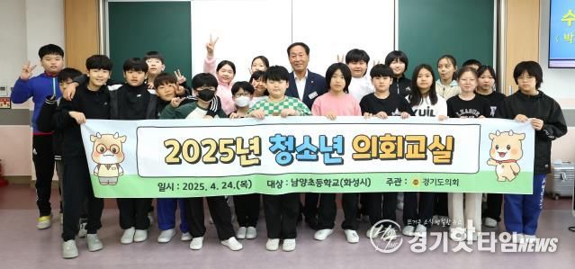 [경기핫타임뉴스=김삼영 기자] 경기도의회 농정해양위원회 박명원 의원(국민의힘, 화성2)이 지난 4월 24일, 화성시 남양초등학교에서 열린 '청소년의회교실' 프로그램에 참석해 인사말을 전하고 참가 학생들에게 수료증을 수여했다.