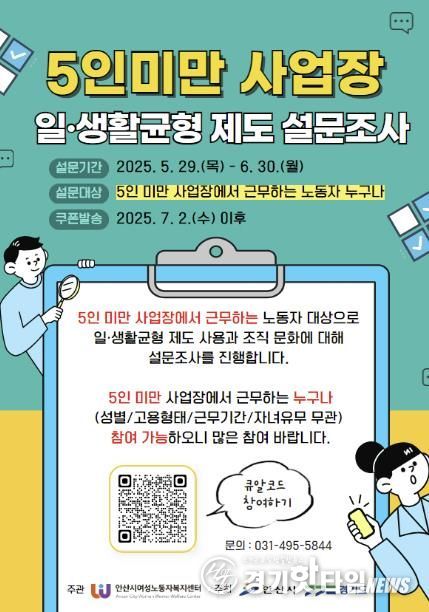 [경기핫타임뉴스=김삼영 기자] 안산시는 안산시여성노동자복지센터에서 5인 미만 사업장에 근무하는 노동자의 일·생활 균형 제도 사용 실태와 조직 문화 파악을 위한 온라인 설문조사를 진행한다고 5일 밝혔다.
