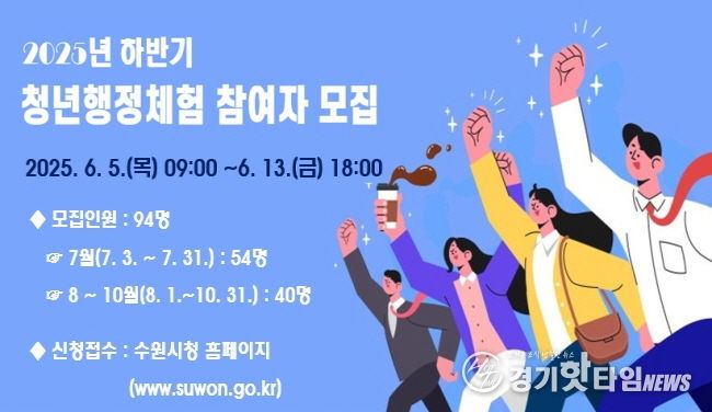[경기핫타임뉴스=김삼영 기자] 수원시가 ‘2025 하반기 수원시 청년행정체험’에 참여할 청년 94명을 5일 오전 9시부터 13일 오후 6시까지 모집한다.