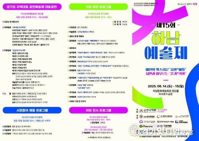 [경기핫타임뉴스=김형철 기자] (사)한국예총 하남지회는 6월 14일-15일 하남문화예술회관 대극장과 미사호수공원 잔디광장에서 '2025 하남예술제'를 개최한다고 밝혔다. 이번 예술제는 2025 경기도 지역대표예술제로 선정되어 하남예총 산하 8개 협회의 공연,전시,체험 행사가 다채롭게 펼쳐진다.