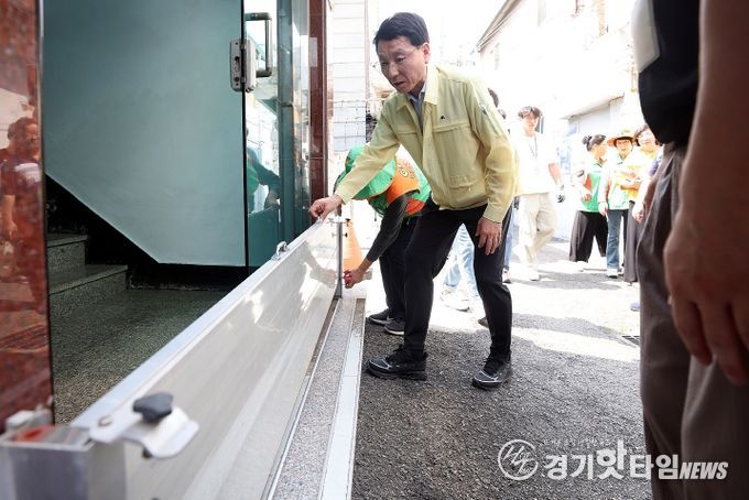 김 부지사는 현장에서 반지하주택 차수판 설치 상태를 직접 점검하고, 빗물받이 준설상황을 확인하며 해당지역의 빗물받이 준설 작업에도 직접 참여했다. 또한 현장 관계자들로부터 애로사항을 청취하고 노고를 격려했다.