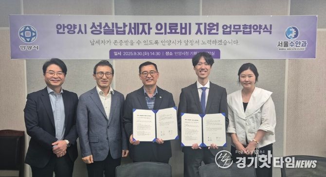 [경기핫타임뉴스=김삼영 기자] 안양시는 지난달 30일 오후 2시30분 3층 기획경제실장실에서 관내 의원인 서울수안과와 ‘성실납세자 의료비 지원’ 업무협약을 체결했다고 1일 밝혔다.