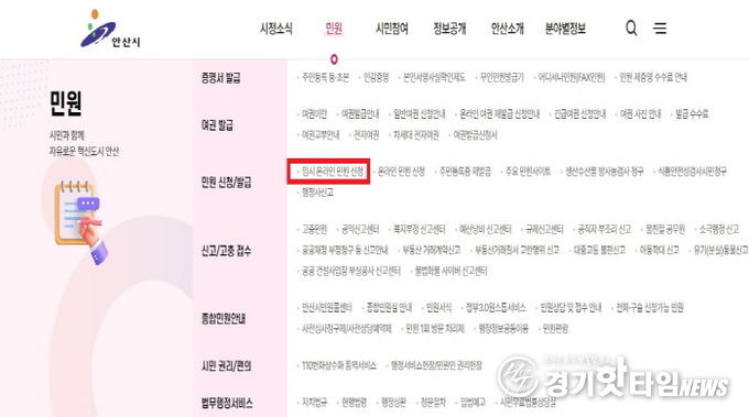 [경기핫타임뉴스=김삼영 기자] 안산시는 지난 13일부터 ‘국민신문고’ 시스템 장애에 대응해 안산시청 누리집에 ‘임시 온라인 민원 신청’ 창구를 설치하고 운영을 시작했다고 14일 밝혔다.