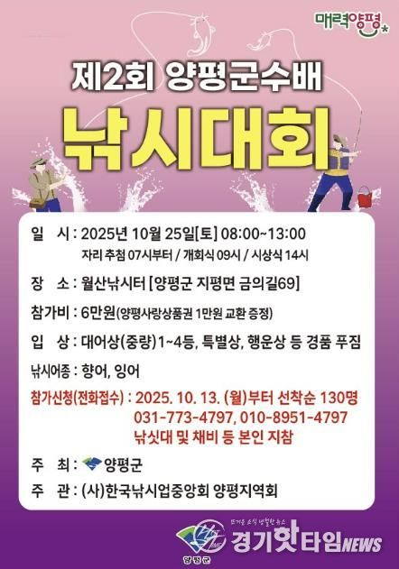 [경기핫타임뉴스=김형철 기자] 양평군은 오는 25일 관내 월산낚시터에서 ‘제2회 양평군수배 낚시 대회’를 개최한다고 밝혔다.